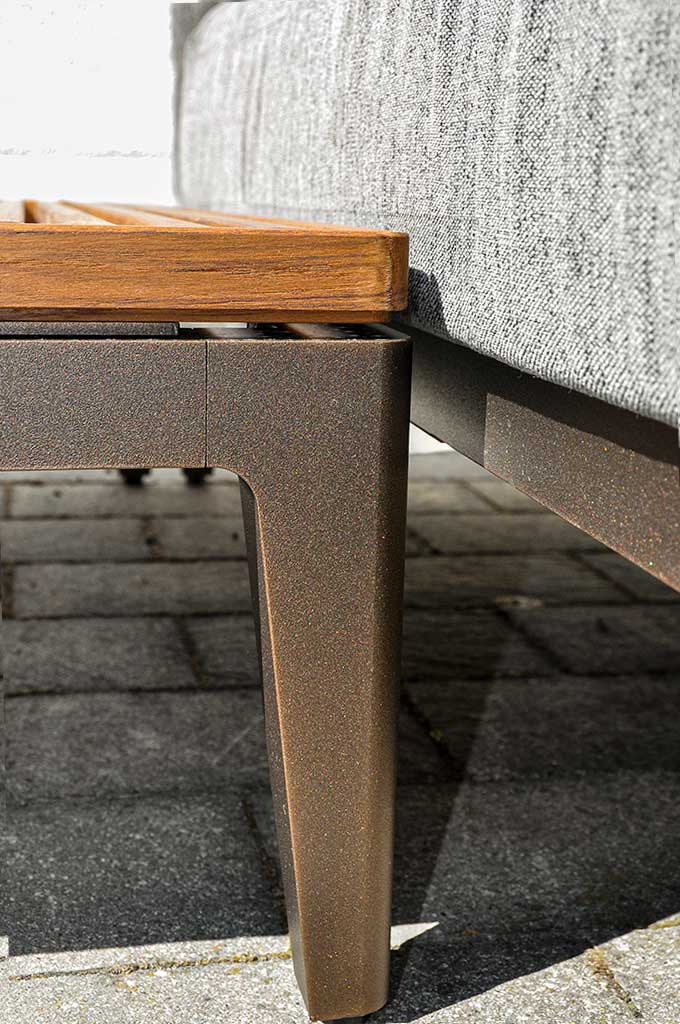 Je nach örtlicher Gegebenheit und den eigenen Wünschen lassen sich die Aluminiumgestelle, Kissen sowie Holz-, Metall- und Steinauflagen frei konfigurieren.